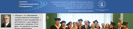 В новом учебном году сотрудничество агентства «ИнтерМедиаКом» и Института коммуникационного менеджмента НИУ «Высшая школа экономики» продолжится. Директора агентства Михаил Каган и Михаил Тайц вошли в число преподавателей в рамках курса «Политические и бизнес-коммуникации», который является единственной в нашей стране полноформатной двухлетней MBA-программой в сфере управления отношениями с общественностью и с органами власти. Выпускники программы получают государственный диплом НИУ ВШЭ о дополнительном (к высшему) образовании с присвоением квалификации «Мастер делового администрирования». В качестве преподавателей и экспертов выступают ведущие российские и зарубежные специалисты в области управления коммуникациями и коммуникационного менеджмента. Постоянными партнерами, которые вносят профессиональный вклад в повышение качества программы и образовательного стандарта, являются кафедра Теории и практики взаимодействия бизнеса и власти НИУ ВШЭ (этой кафедрой заведует непосредственно Президент НИУ ВШЭ Александр Шохин), Российский союз промышленников и предпринимателей, ведущие политические и деловые структуры России. Подробности о работе Института коммуникационного менеджмента можно изучить на веб-сайте ikm.hse.ru, который на прошедшей неделе был полностью обновлен под учебные планы 2012-2014 годов.